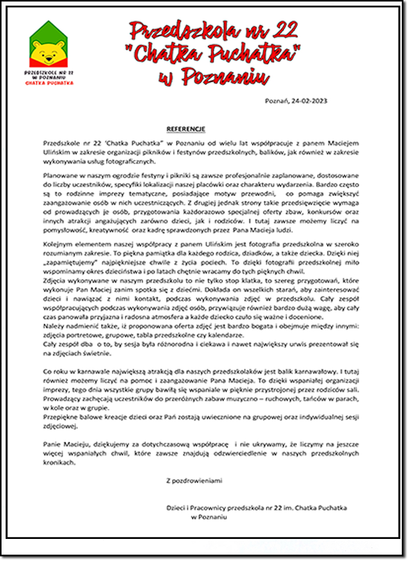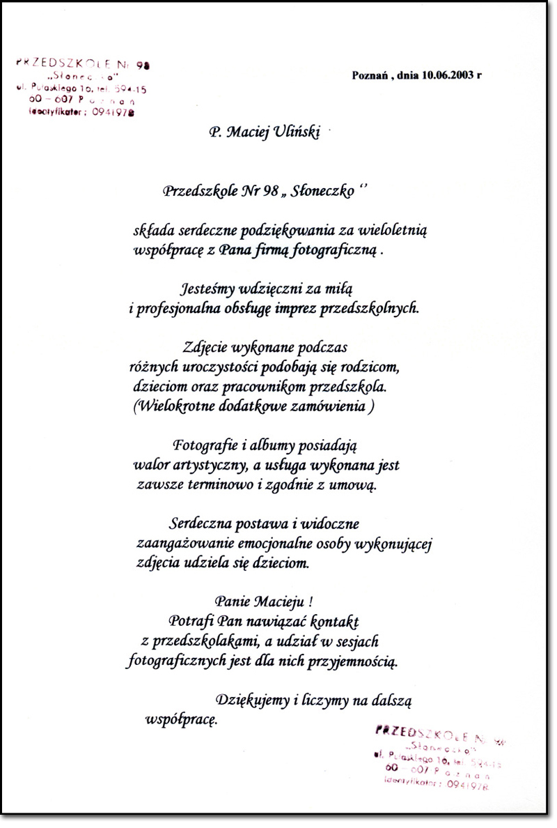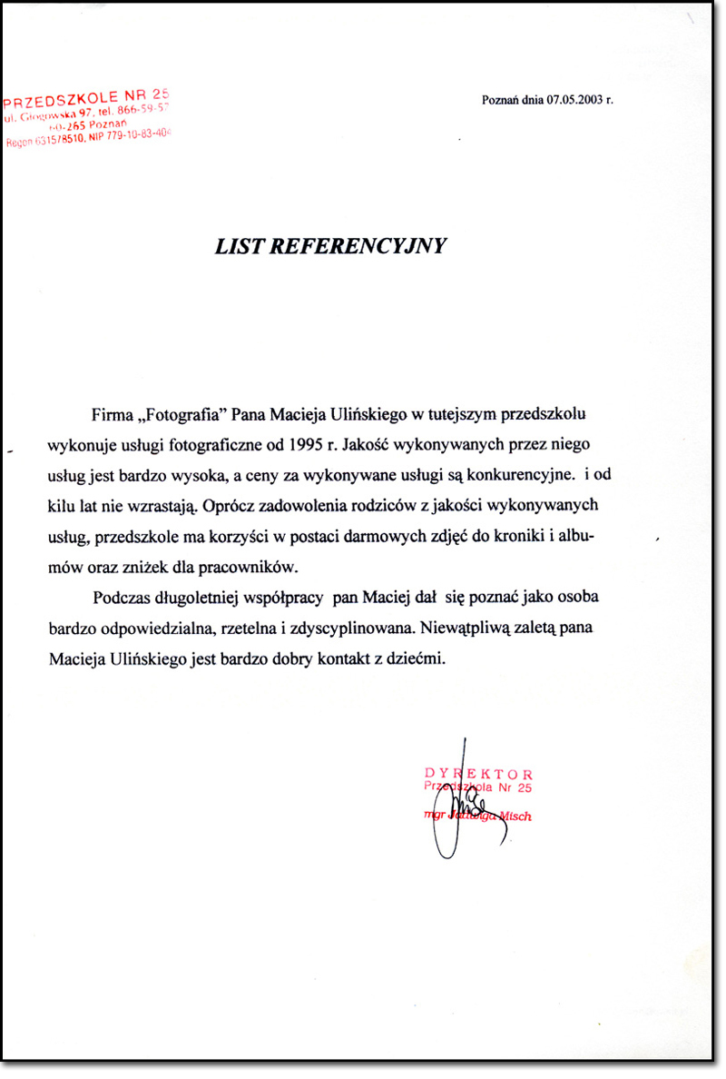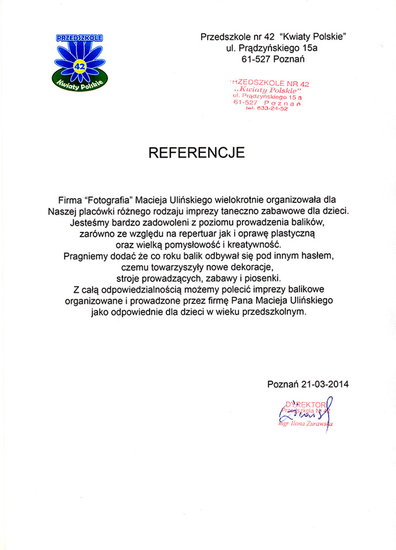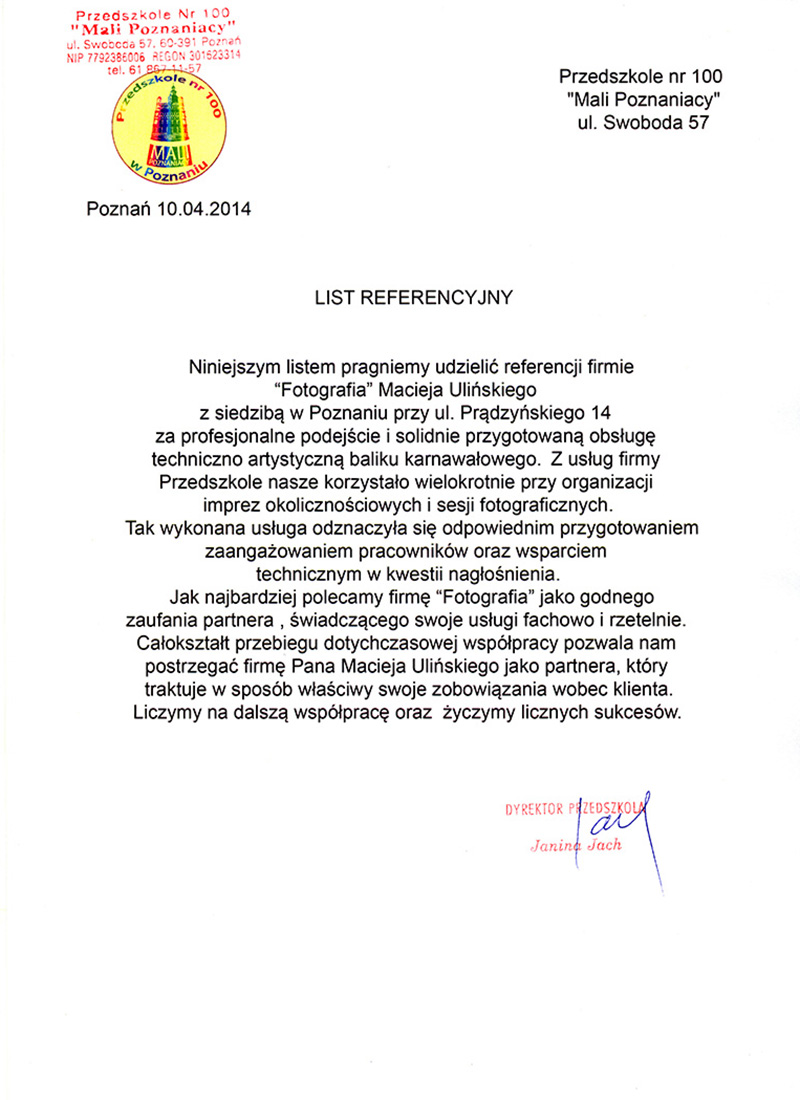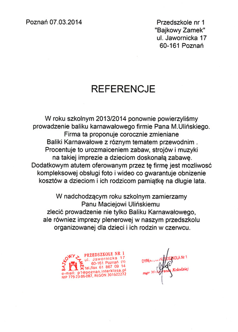 Przedstawiam niektóre referencje wystawione nam przez różne Firmy, Pary Młode i Przedszkola. Zapraszam do zapoznania się z nimi tych z Państwa, którzy chcieli by uwiarygodnić jakość świadczonych przez naszą Firmę usług.