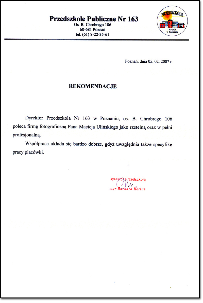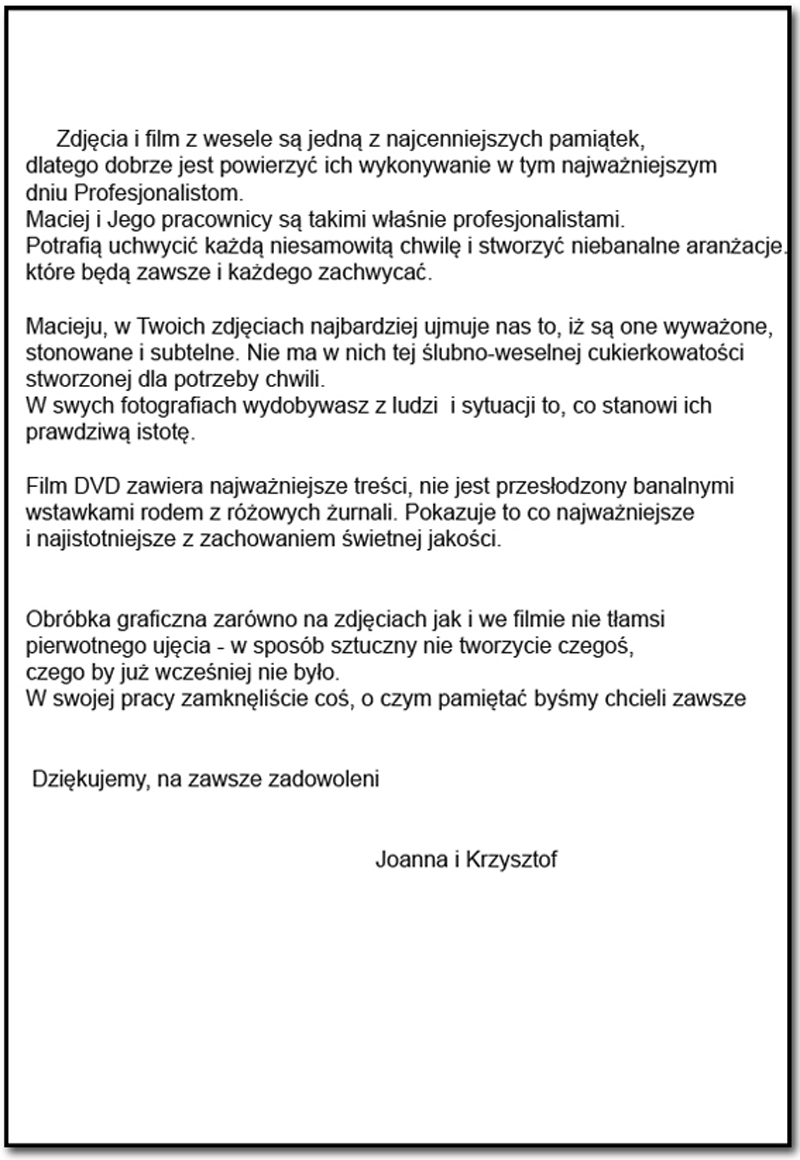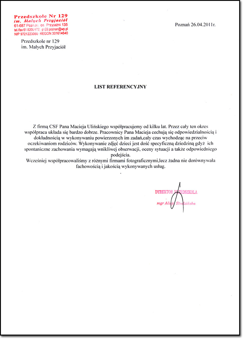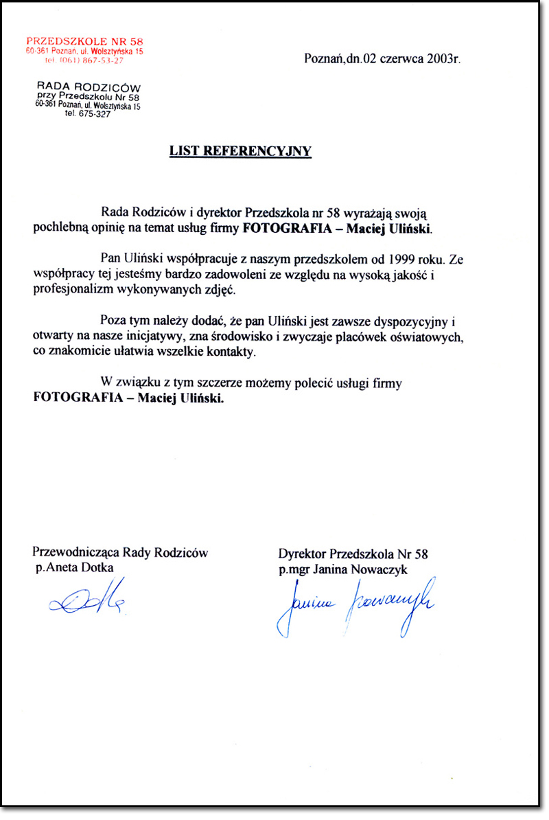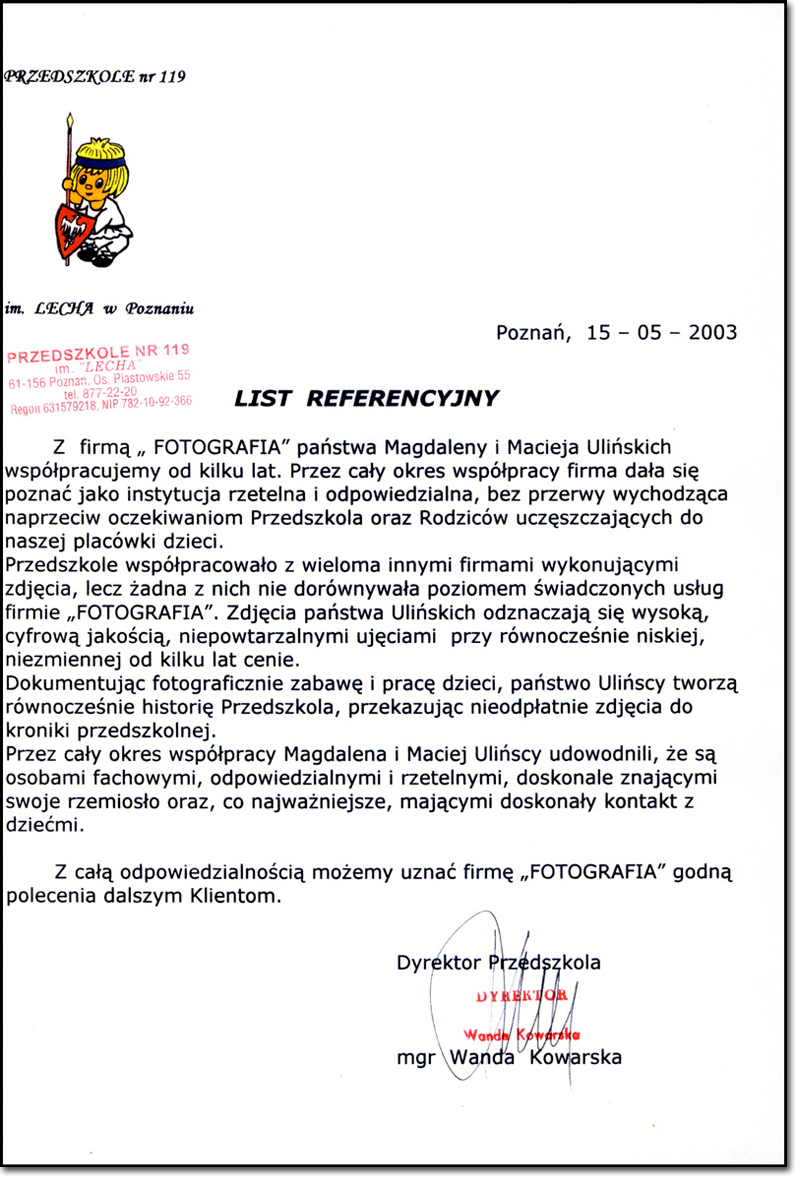 Przedstawiam niektóre referencje wystawione nam przez różne Firmy, Pary Młode i Przedszkola. Zapraszam do zapoznania się z nimi tych z Państwa, którzy chcieli by uwiarygodnić jakość świadczonych przez naszą Firmę usług.